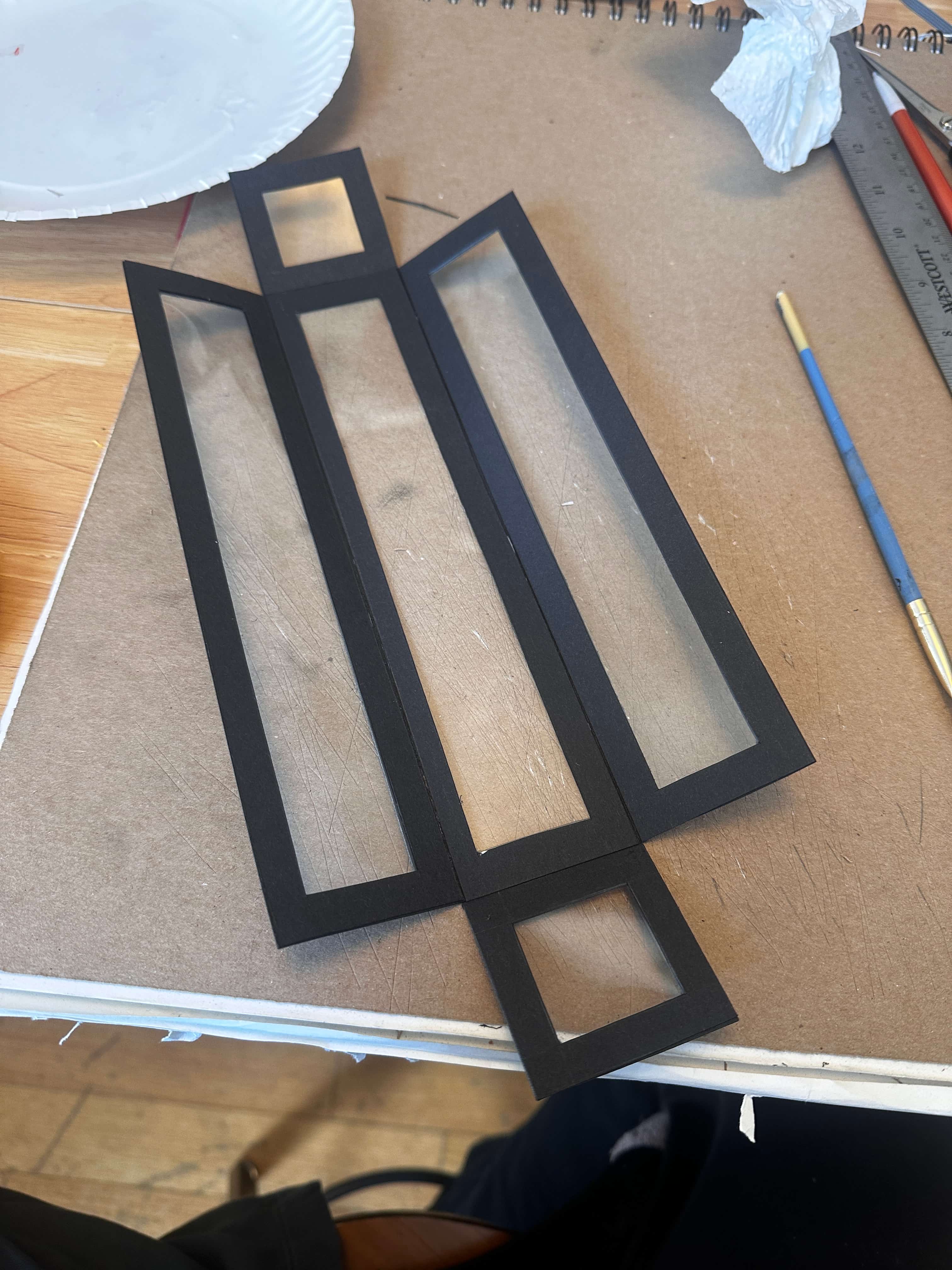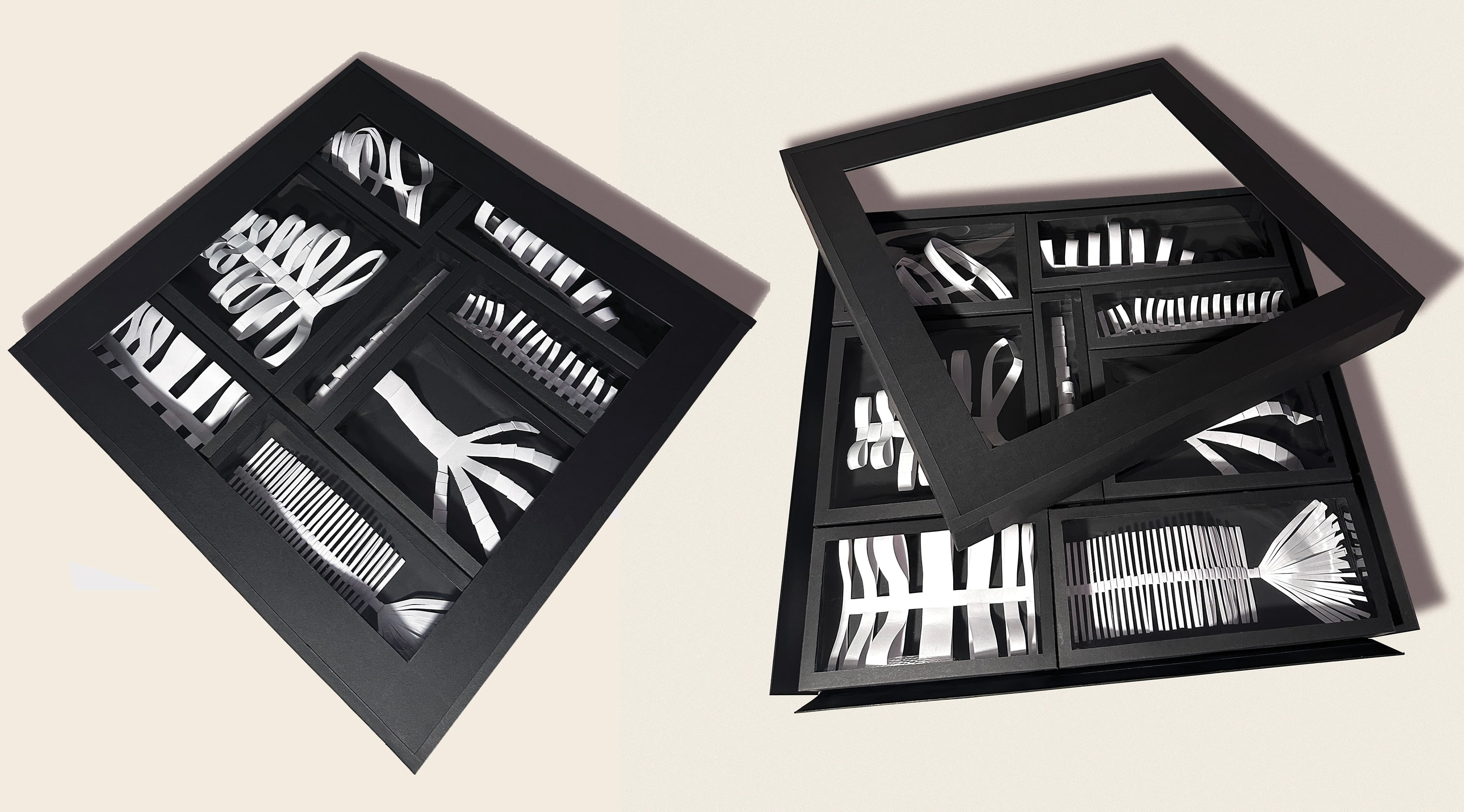 After creating the scructures I designed a way to package and protect them since they are so delicate but also display them. I used mat board and clear acetate to create boxes with window frames to show off every angle of the structures. They all fit snuggly into a larger box that collapses when the window frame lid is removed. Each box can be taken out and observed then put back into the larger box for safe keeping and display.
