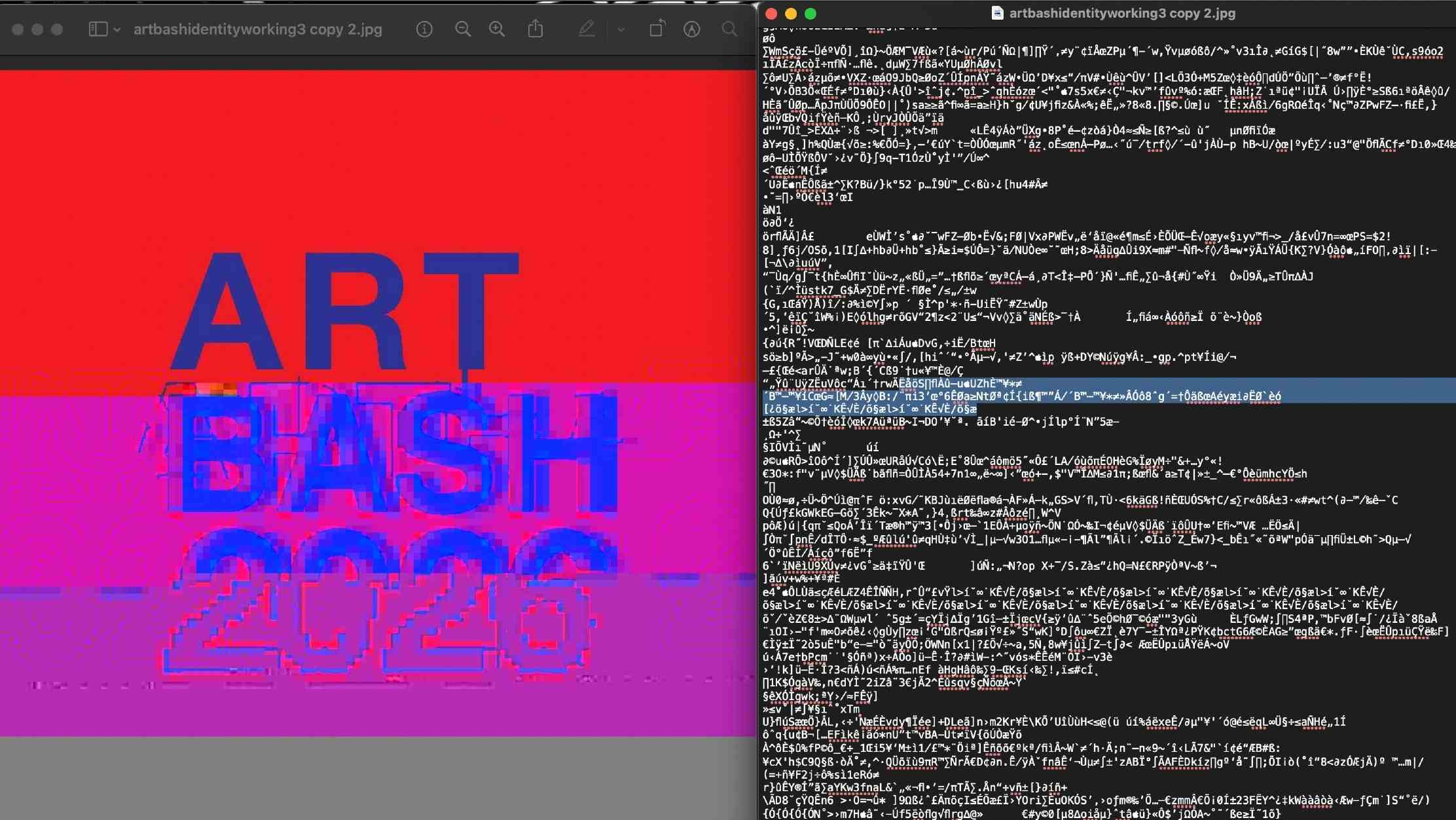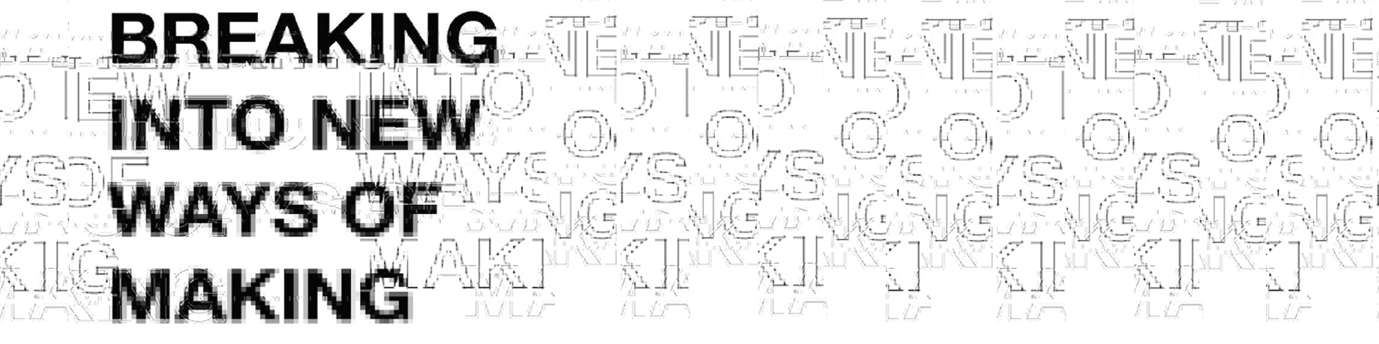 All of the glitch imagery was created by editing the source code of images of typography. I first designed bold Helvetica Neue text in Adobe Illustrator, stacked in the center of a poster-sized document. Some backgrounds are solid, others use gradients. I exported the vector type as a JPEG—the compression quality determines how extreme the glitching can become. Next, I opened the JPEG as a text file in my computer’s default text editor. When viewed this way, the image’s pixel data appears as code that tells the computer how to render it. I kept the original image open beside the text file to see changes in real time. As I altered and saved the text, the image shifted accordingly. The edits compound, allowing me to push the distortion further and reveal unexpected colors and shapes.