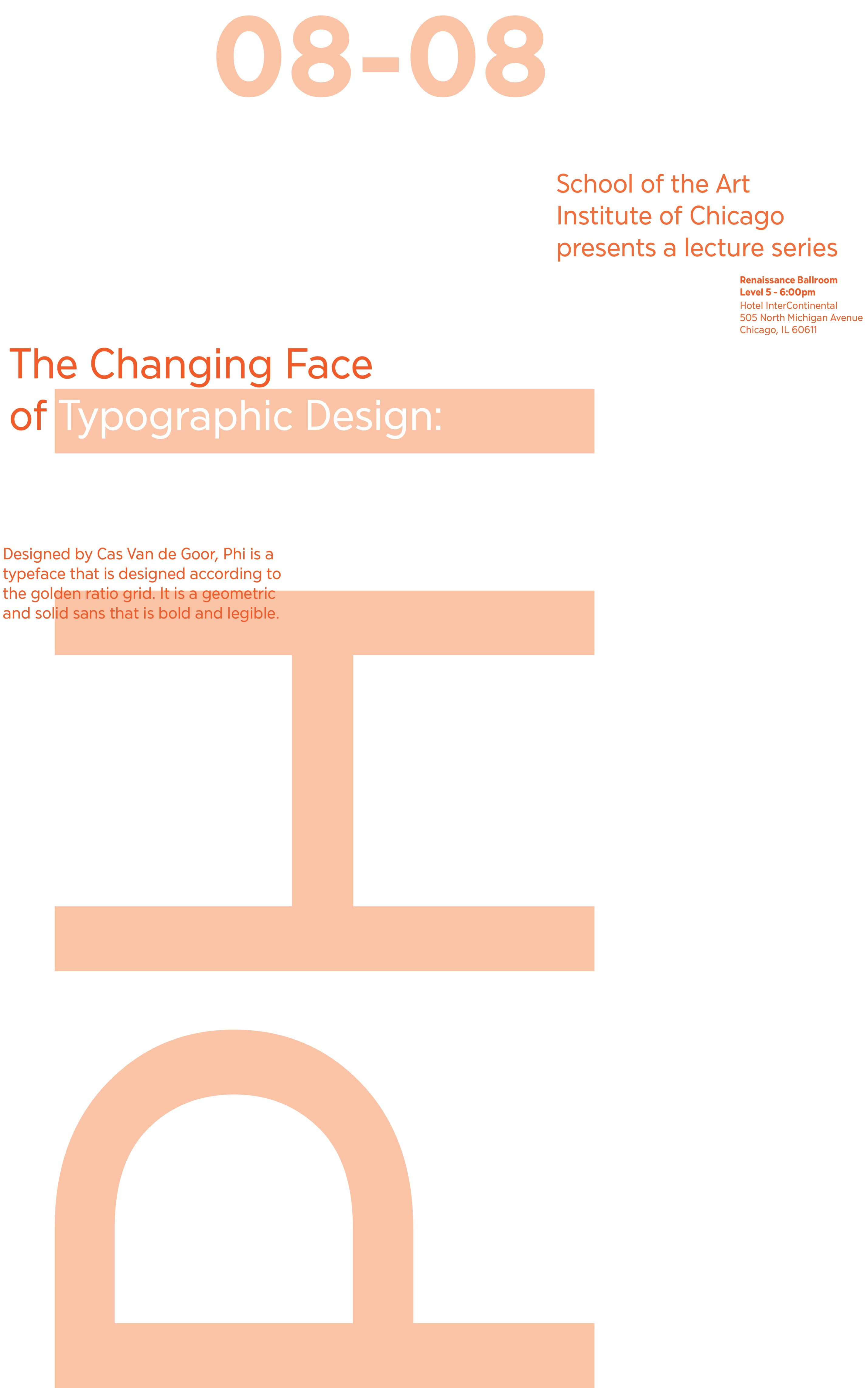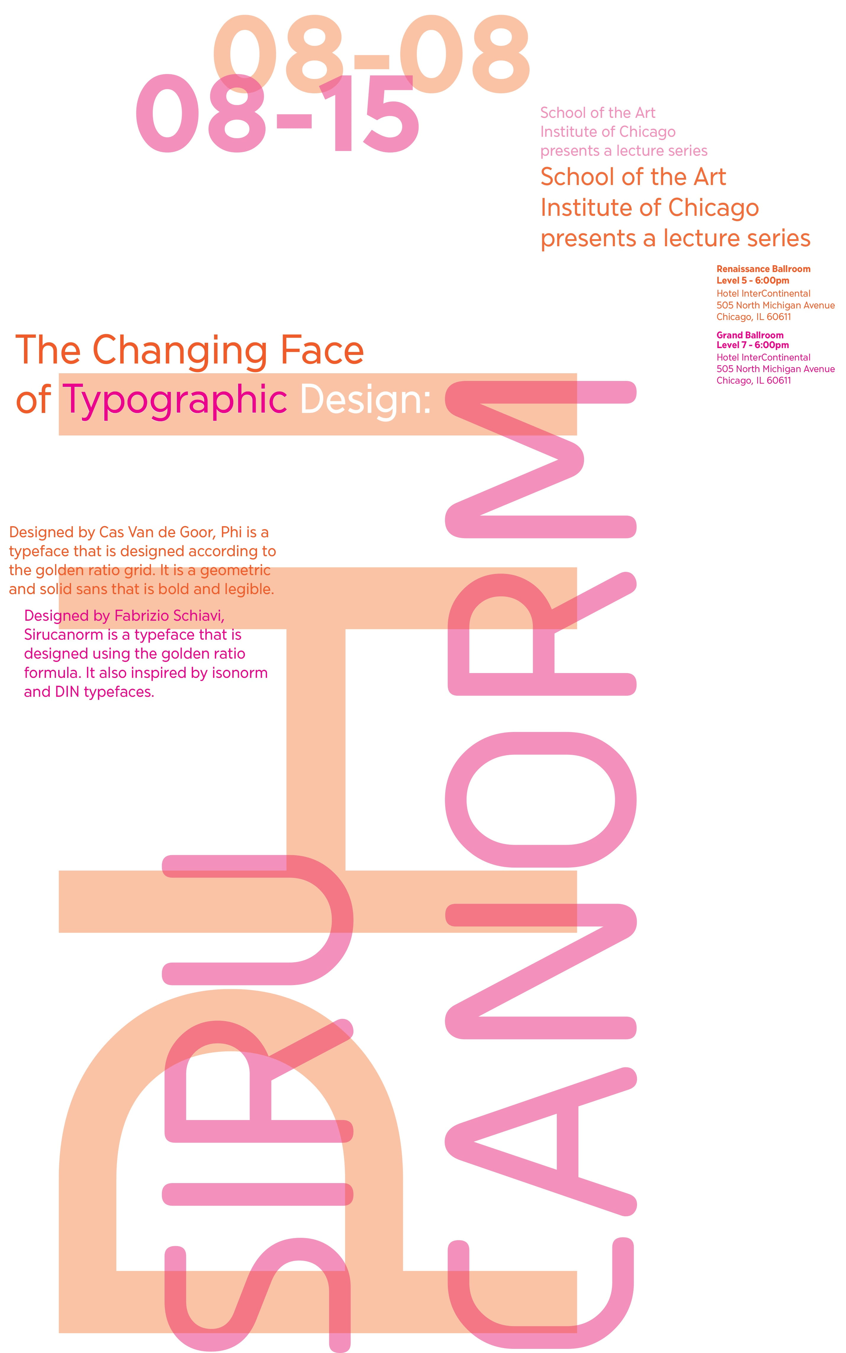 Since the typefaces are heavily influenced by the golden ratio, I wanted to bring that into every other aspect of the posters that I could. I chose the size based on the golden ratio and used a fibonacci grid to guide the placement of the elements. The type placement and size mimmicks the spiral. I also limited myself to fontsizes that are in the sequence.