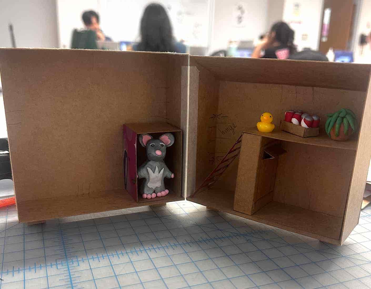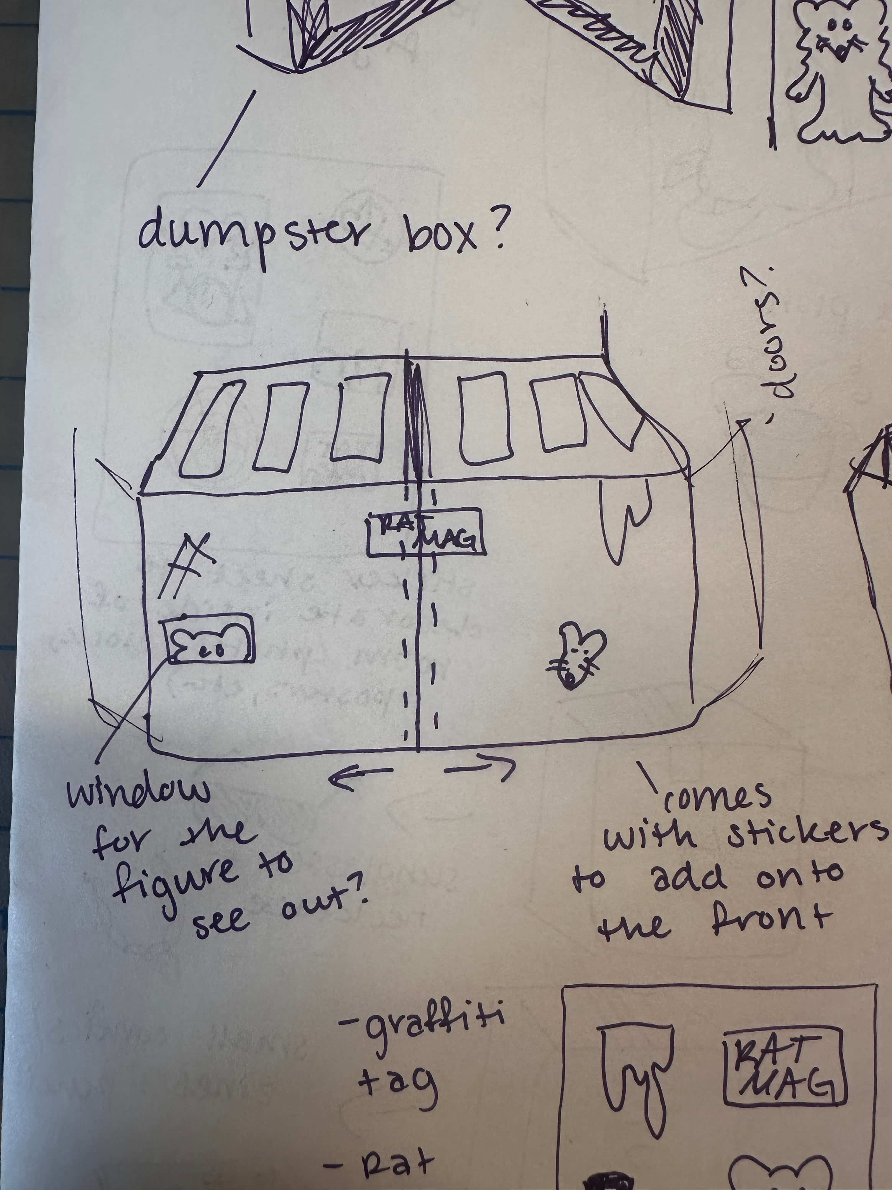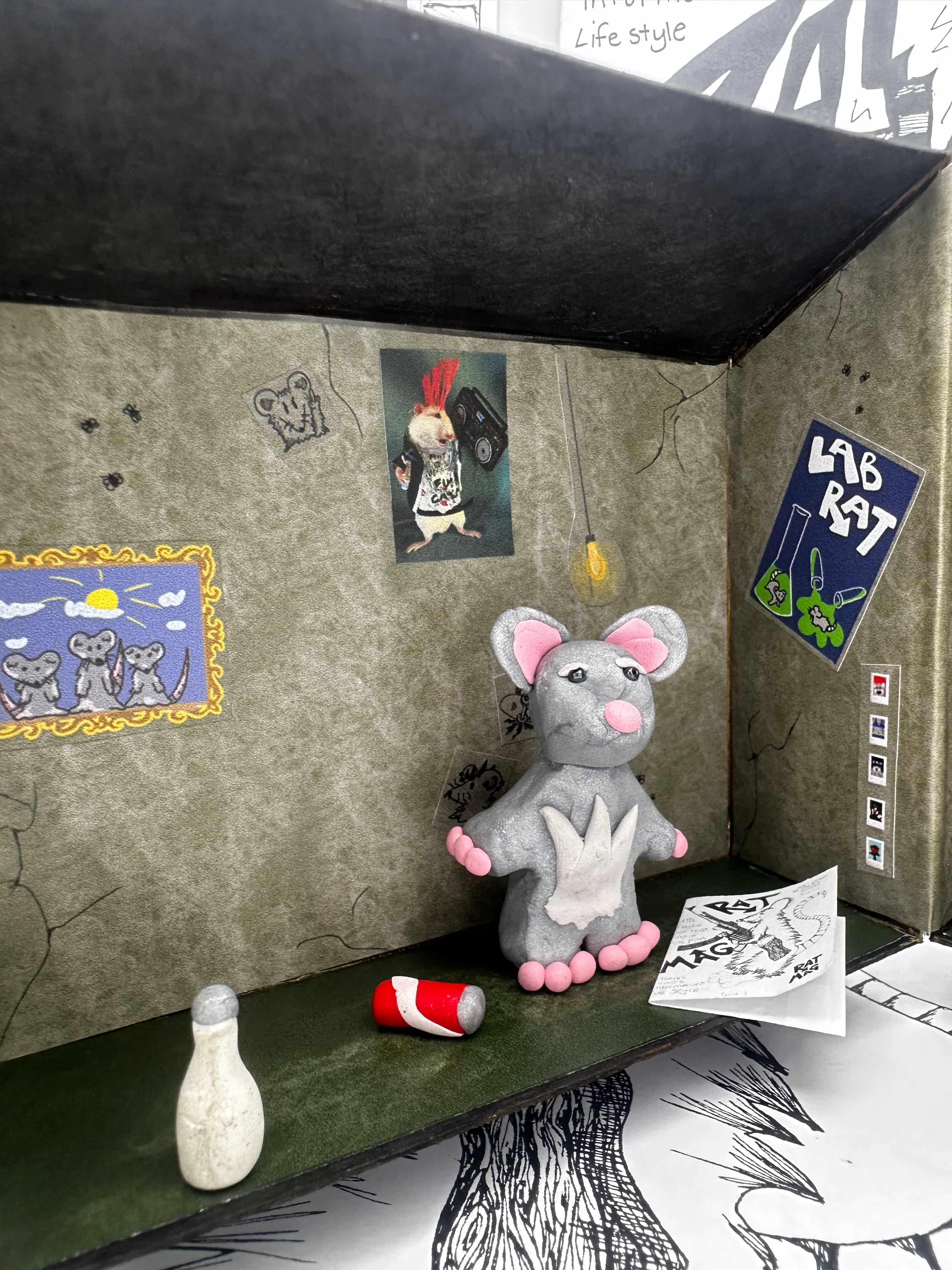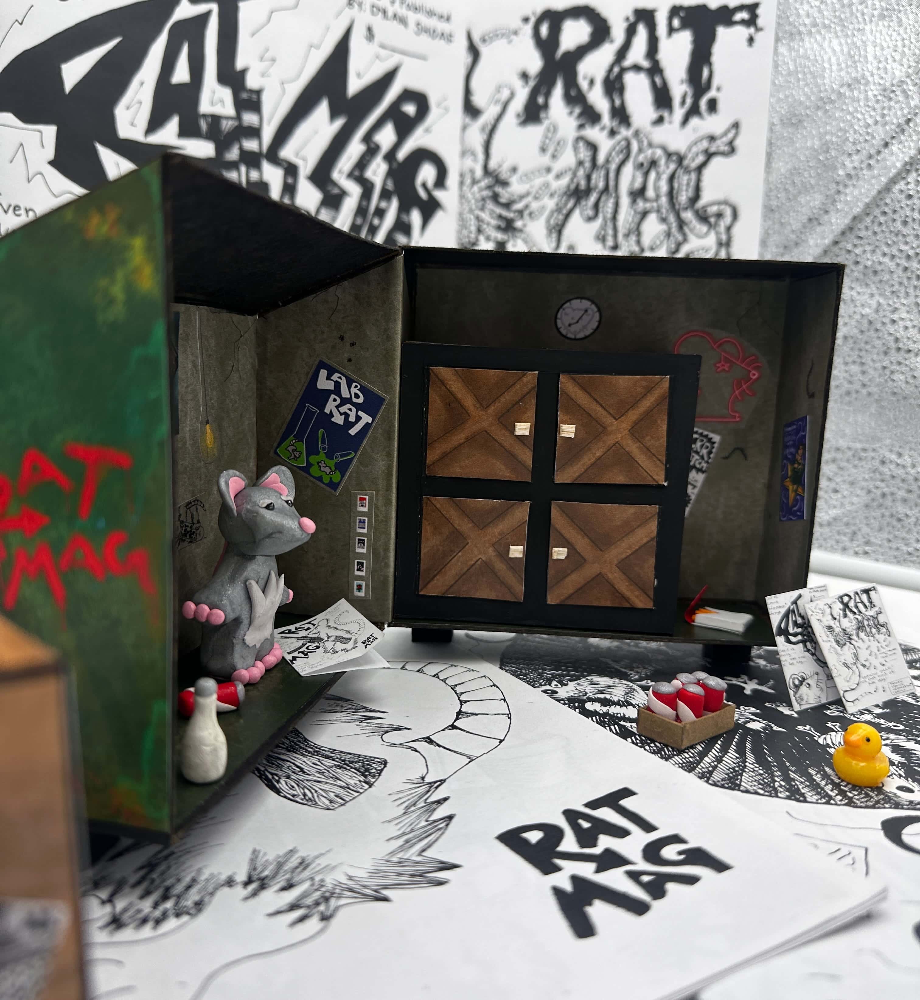 For my packaging design class final project I created a Polly-Pocket-inspired toy set for my rat character that is featured in many of my comics. There is an irony at play when relating a girly doll house kid's toy to my rat in his dumpster. Instead of clothes, shoes, and pink decor he comes with cigarettes, sodas, comic books, and posters to litter his walls with.