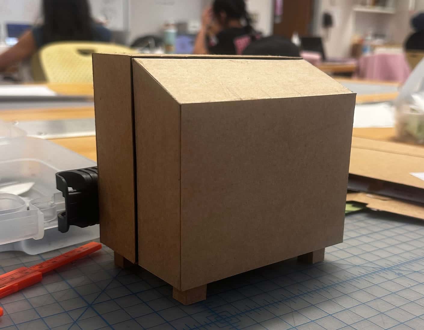 The dumpster is made of pieces of thin bookboard. It is assembled without tabs so the inside and outside are both smooth. Both sides of the dumpster were built seperately and hinged together by the vinyl sticker decals covering the dumpster. This makes it so the dumpster is flexible enough to comfortably sit open or closed.
