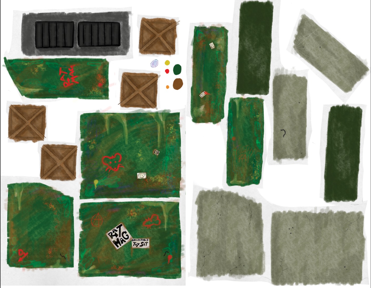 To make the decals, I traced the dumpster and scanned the pattern at size. I brought this into Procreate and drew the textures and details that make the dumpster look yucky and lived in. I used the same color and texture of the inside walls on the sticker sheet withe the interior decor so reguardless of the cut path, the stickers will look as seamless as possible on the walls.